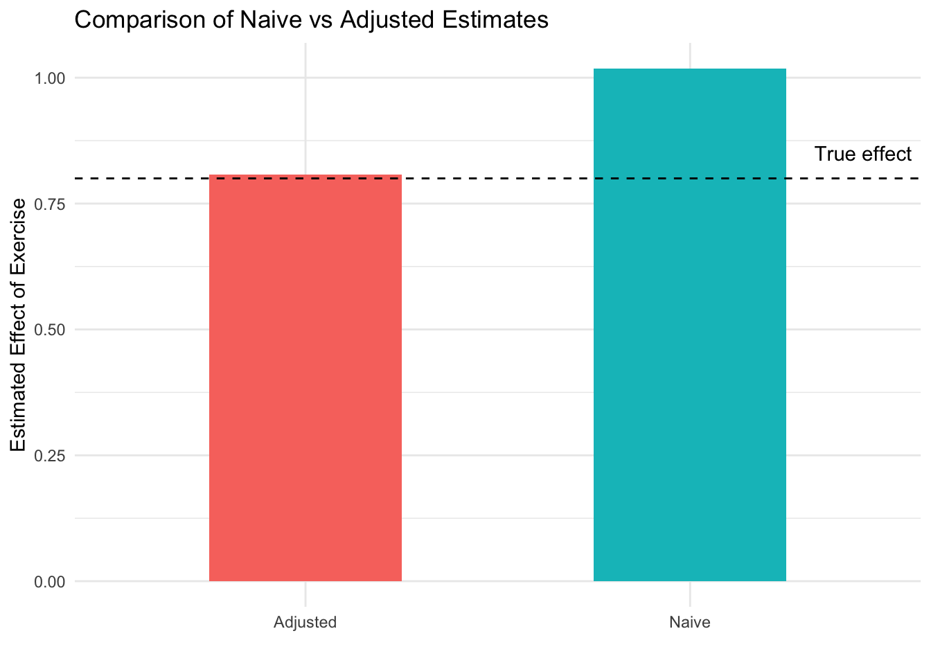 In this simulation, we model a situation where Genetics (Z) is a confounder that influences both Exercise (X) and Heart Health (Y). The naive model, which regresses Heart Health on Exercise without adjusting for Genetics, gives a biased estimate of the effect of Exercise (1.05). This happens because part of the observed association is actually due to Genetics, not Exercise itself. When we adjust for Genetics in the second model, the estimate of Exercise’s effect (0.84) becomes more accurate, isolating its true relationship with Heart Health. This is shown in how the bar for the adjusted graph is closer to the dotted black line, which represents the true causal effect of exercise (0.8). This example highlights how failing to account for confounding can lead researchers to overstate or misinterpret causal effects in public health and medical studies.